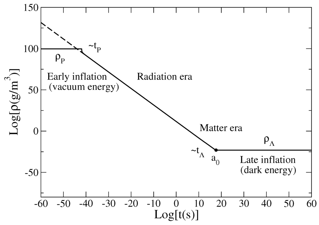 The evolution of the universe may be divided into four main periods [1]. In the vacuum energy era (Planck era), the universe undergoes a phase of early inflation that brings it from the Planck size to an almost “macroscopic” size in a tiniest fraction of a second [2,3,4,5]. The universe then enters in the radiation era and, when the temperature cools down below approximately , in the matter era [6]. Finally, in the dark energy era (de Sitter era), the universe undergoes a phase of late inflation [7]. The early inflation is necessary to solve notorious difficulties such as the singularity problem, the flatness problem, and the horizon problem [2,3,4,5]. The late inflation is necessary to account for the observed accelerating expansion of the universe [8,9,10,11]. At present, the universe is composed of approximately baryonic matter, dark matter, and dark energy [1]. Despite the success of the standard ΛCDM model, the nature of vacuum energy, dark matter, and dark energy remains very mysterious and leads to many speculations.
