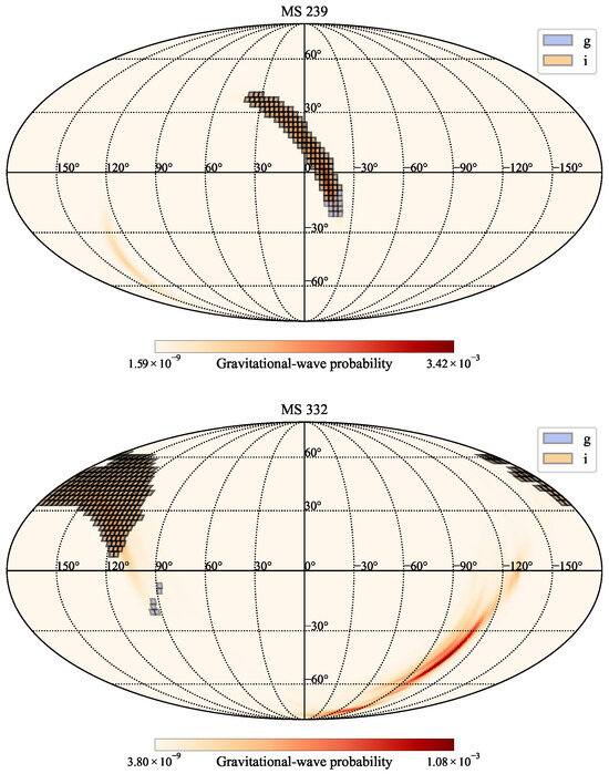 In the process of generating survey plans, gwemopt includes several algorithms within each step: (1) skymap tiling, (2) time allocations, (3) scheduling. Coughlin et al. [42] extensively discussed the efficiency of various combinations of these algorithms, determining that the combination of the (1) MOC algorithm, (2) power-law algorithm, and (3) greedy algorithm yielded the most efficient results. Therefore, we employed this combination of algorithms for our simulations. Specific inputs need to be prepared before running the code, namely the merger event, exposure time, bands, and observation windows. Initially, the merger times for the GW events were randomly distributed from 1 January to 31 December 2024 to match the future operational timeline of O4. The selection of nightly coverage frequencies and bands was based on the observable area of the events and the lunar phase conditions. and bands were prioritized around the new moon and full moon, respectively. We also adjusted our exposure time according to the luminosity distance of the event and the estimated time spent in observation. Currently, we assume an observation window for three days post-merger, during which WFST would repeatedly cover the target area. Upon the completion of the code, it will generate a list containing the corresponding pointings for each exposure, the observation time, and the cumulative probability within the coverage area as output. We show two examples of the GW skymap, MS_239 and MS_332, and the corresponding triggered WFST ToO survey in Figure 1. The tiles in the map are footprints of a one-night survey.