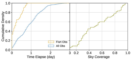 (Left panel): Cumulative density of time elapsed of the follow-up, first, and all observations. (Right panel): Cumulative density of sky coverage of triggered events by WFST.