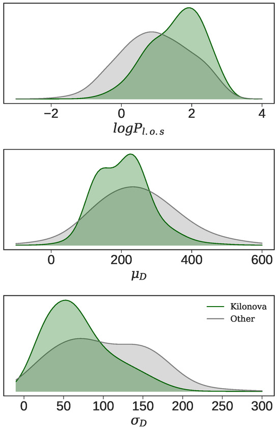 We randomly looped 60 skymaps and collected their lightcurves and object information, e.g., line-of-sight probability , distance mean and standard deviation derived from GW skymap. It is noted that for supernovas, we truncate the distance with , which is comparable to the detection depth of WFST. Finally, we obtained the data set containing 77,005 objects, the details of which are listed in Table 1. Since we aim to distinguish true KN among many contaminants, we labeled Bulla KN and MOSFiT KN as Kilonova and the rest as Other. Figure 3 shows the normalized distribution of line-of-sight probability, mean, and standard deviation of luminosity distance of transient according to the GW skymap of our dataset per class. One can see that the KN has a tighter distribution of features compared with contaminants because they always happen in the high probability area of the GW skymap. In addition to the lightcurve, these features could also assist us in classifying KN and contaminants.