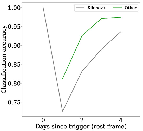 For our purpose of classification for KN in ToO data, which lasts 3 days post-merger, as shown in Figure 2, we used a network of filter length and dilation layers and 2 stacks to deepen the network. We employed categorical cross-entropy as the loss function in conjunction with the Adam optimizer. For the dataset, we partitioned it into a training set comprising 70% of the data and a test set containing the remaining 30%. By testing, we found that loss tends to converge after 50 epochs of training, so we trained models for 50 epochs. Approximately 2–3 h were allocated for training and testing models. Notably, we found that the computational cost for training is comparatively modest, negating the necessity for hardware optimizations, such as GPU acceleration. Figure 5 shows the accuracy per class with time in which at least 3 days of observation yields good accuracy. The classifier tends to predict a high KN score inaccurately in instances where photometry data are lacking, as evidenced by a noticeable decline around day one. However, as more photometry data are processed, the predictions converge more closely toward the actual label.