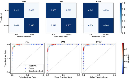 Using the dataset simulated in Section 2 and the TCN framework described in Section 3, we obtain MD, PM, and PMD classification models for WFST targeting KN. Among them, the PMD model reaches an overall accuracy of 98.41%. To test the performance of a classifier, it is natural to employ a confusion matrix to show their capability. In our binary classification issue, the dimensions of the confusion matrix are , with true positives and true negatives residing in diagonal elements, while false positives and false negatives lie in the upper right and lower left elements, respectively. Figure 6 illustrates the confusion matrices for the MD, PM, and PMD models. The matrix values are normalized by the number of true labels, and the KN score is the last KN probability in the sequence of prediction. In the context of prioritizing the detection of KN, a threshold of 0.45 is selected to minimize the potential for false positives. Specifically, we classify a candidate as a KN when the predicted KN probability in the final epoch surpasses this specified threshold. Upon comparing these models, it becomes evident that the MD model exhibits lower efficiency when contrasted with the other two alternatives.