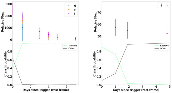 To further investigate the performance of the classifier, we employed similar procedures as in Chatterjee et al. [48] to test in unseen data. We considered Swope observations on AT2017gfo [91], originally identified as ‘SSS17a’ by the Swope team at the time of its discovery. It was the only identified KN accompanied by GW so far, with ejecta mass , via the fitting of various KN models [18,24,28]. We used band data to be compatible with our trained model input. Although the optical transmission curves of Swope are different from WFST, we maintain the belief that these disparities in the KN score’s uncertainty will not lead to misleading classification results. Additionally, we also consider a counterpart candidate of GW190814 [92], AT2019npv, which was an SN Ibc but was identified as KN in the early phase by efforts of several teams because it was located in the GW skymap, and the redshift was consistent with the distance information of GW [30,93,94]. We included the first week band observations from DECam as the WFST survey would not exceed 5 days.