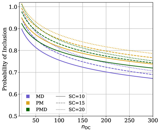 Best-fit probability of inclusion with for various models. The PM model could reach over 80% probability of inclusion when .
