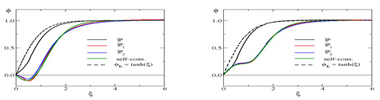 Profiles for and . (Left panel): configuration, (Right panel): . The full black line (labeled ) arises from minimizing the total energy, Equation (16). The other lines (, , self-cons.) are configurations obtained from minimizing the reduced energy functional, Equation (19). The legends refer to the notation of Table 1 and Table 2. For completeness, we also show the kink without any fermion interaction (dashed lines).