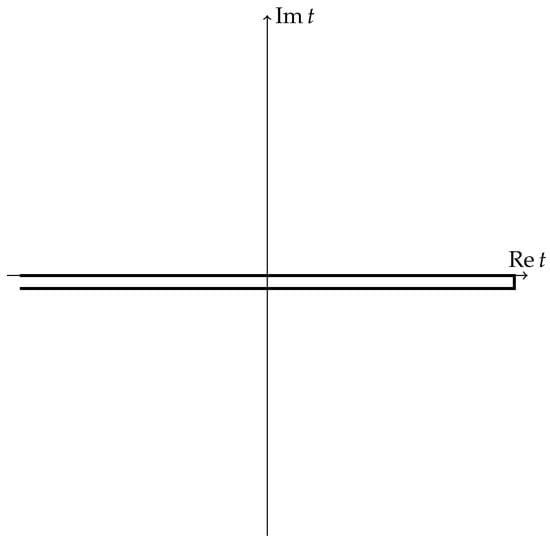 Representation of the Schwinger-Keldysh contour. The thicker line represents the complex time contour along which the path integral is defined in non-equilibrium field theory. It goes from to ∞ and then goes back to but decreases the time’s imaginary part by an infinitely small amount.