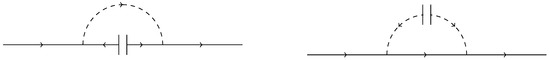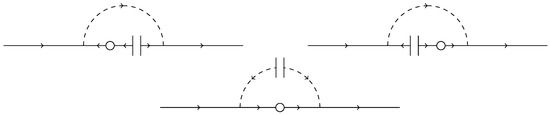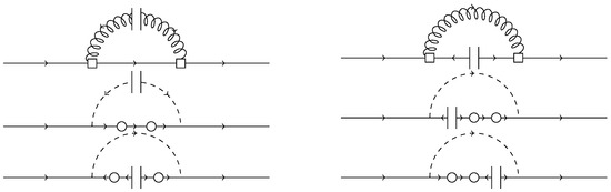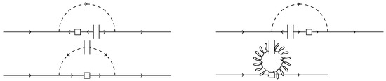 As an illustration, let us discuss the perturbative matching. This can be carried out by looking at the diagrams in Figure 6 and Figure 7, but now taking into account that the expansion in Equation (23) cannot be achieved since . We obtain that