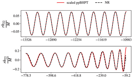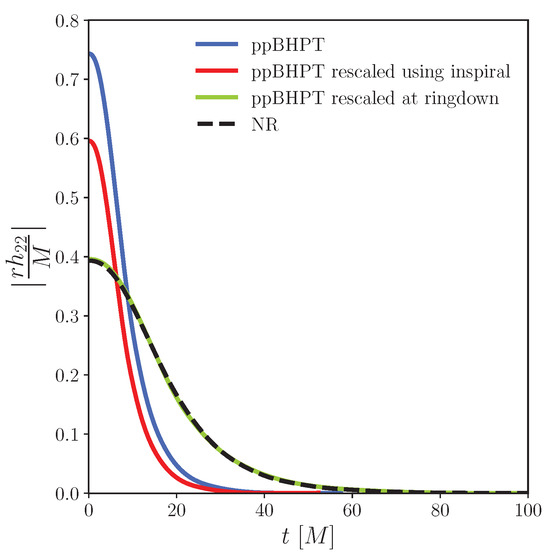 We first consider whether a simple scaling (Equation (1)) exists for equal-mass binaries. We find that Equation (2) is minimized at and where . In Figure 1, we show both the NR and rescaled ppBHPT waveforms. Additionally, for comparison, we show the ppBHPT waveform after only accounting for the mass scale differences as described in Section 3.2.