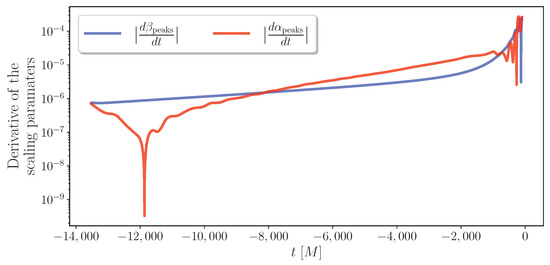 Time derivative of the scaling parameters and obtained locally using the “peaks” method summarized in Section 3.4. While the derivatives are not zero, they remain small and increase in the late-inspiral stage. This explains why the - calibration technique, which assumes time-independent values for and , works particularly well in the inspiral. Further details can be found in Section 3.4.