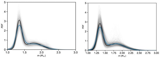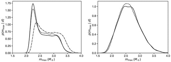 We now proceed to investigate the impact of a uniform distribution for on the posterior distribution of . Following the approach of Alsing et al. [32] and Shao et al. [34], we obtained the marginalized posterior distribution shown by the solid line in the left panel of Figure 2, with a maximum of ∼2.2 . On the other hand, the marginalized posterior distribution for the model where all pulsars are assumed to be normally distributed (“accuracy-independent” model) is shown by the solid line in the right panel of Figure 2, with a maximum of around . In addition to the maximum values that differ considerably between the two treatments, the shape of the distribution changes significantly too, as we can see in Figure 2.