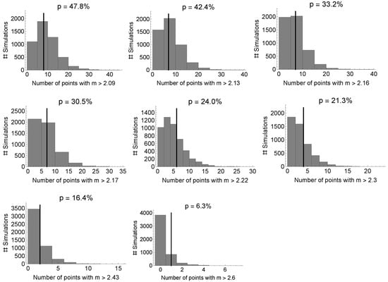 Using the mean values reported in Table 5, we then generated 10,000 posterior predictive distributions using the software MATHEMATICA (https://www.wolfram.com/mathematica accessed on 26 October 2023). Subsequently, we defined the test quantity, T, as the number of elements in the observed sample with masses exceeding a specific value, referred to as “”. This approach enables us to examine the upper limit for the distribution. The p-value is derived from the number of times . To illustrate, the top left panel in Figure 3 offers insight into the probability of detecting new objects with in future observations, which is , a high value. A p-value close to zero is consistent with a mass limit, i.e., a low p-value implies a reduced probability of detecting new objects with masses exceeding the associated value. Through this alternative analysis, we confirm that the distribution of galactic NSs supports high values, such as the we found from the “accuracy-independent” model.