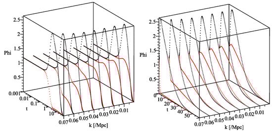 Figure 5 plots the value of at the time of the phase transition, and the square of it will give the primordial spectrum that is an initial condition of the subsequent time evolution. The right normalized panel shows that the nonlinear term has effects of flattening the spectrum even in the region . In the previous linear equation results [22], the spectrum was greatly deformed at , but it can be seen that the nonlinear effect suppresses the deformation up to the high momentum region, exceeding 3 times m.