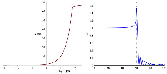 The (left) shows the time evolution of the scale factor a and the (right) shows that of the Hubble variable H, where is normalized to unity. The vertical dotted line represents the phase transition time . The subsequent behavior is derived from a low-energy effective theory of gravity defined by derivative expansions in the gravitational field [22].