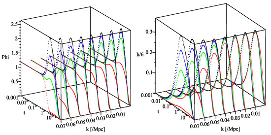 The system of linear evolution equations for the fluctuations has already been derived, and it has been shown that the fluctuations gradually reduce during inflation [22,23]. However, since is still large in the initial stage, we cannot accurately estimate the fluctuation spectrum without incorporating nonlinear terms involving multipoint functions of there. The exponential factor of existing in the Einstein–Hilbert action provides such terms. On the other hand, h is treated in the linear approximation, assuming that it is not very large, which is because h is initially small. It then grows, but reduces again before the coupling constant t becomes large. Thus, nonlinear terms are limited to first order in h.