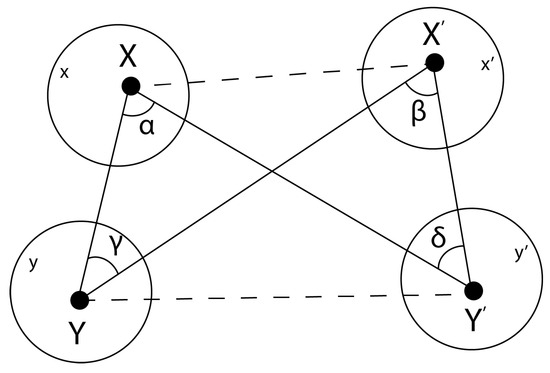Illustrating the CHSH experiment where x, , y, and denote -disks associated with nominal measurement settings under the control of the experimenters. X, , Y, and are points on the unit 2-sphere corresponding to exact measurement settings, and straight lines correspond to great circles joining these points. By the relationship and , fixing and a nominal measurement setting fixes an exact measurement setting. As discussed in the text, if Alice and Bob chose the nominal settings , then by the Impossible Triangle Corollary with fixed, the exact settings associated with one of the three counterfactual nominal settings , , or cannot satisfy the rationality conditions of RaQM.
