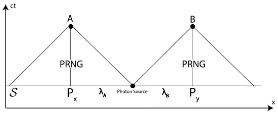 With this in mind, we let describe all of the variables which, over and above and , determine the exact measurement settings X and Y. These variables include Andromedan butterflies and electrons at the end of the visible universe. When measuring a single qubit, we can frame it like this: consider a spacelike hypersurface in the past of some event where the measurement outcome was known, and before the event where the PRNG output was known, then must include data on , on and inside ’s past light cone, with the exception of (or its determinants). In this way, we can write , . The extension of this causal picture for entangled qubits is discussed in Section 5.3.