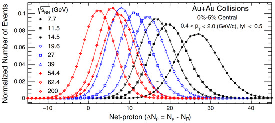 - Abdallah, M. et al. [STAR Collaboration] Measurement of the Sixth-Order Cumulant of Net-Proton Multiplicity Distributions in Au+Au Collisions at sNN= 27, 54.4, and 200 GeV at RHIC. Phys. Rev. Lett. 2021, 127, 262301. [Google Scholar] [CrossRef]