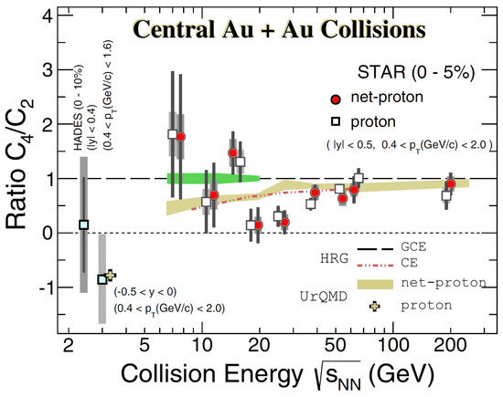 Figure 3 shows the collision energy dependence of net-proton in Au+Au most central collisions from BES-I [5,6] and the FXT program at GeV [32,33]. The value is consistent with the Poisson baseline at GeV while it decreases with decreasing collision energy, reaching a minimal value at 19.6 GeV. The ratio seems to increase above the Poisson baseline at lower collision energies down to 7.7 GeV. The collision energy dependence was found to have nonmonotonicity of 3.1 . The observed nonmonotonic collision energy dependence is qualitatively consistent with the model calculation incorporating the QCD critical point [35], and therefore the BES-I results could indicate the existence of the critical point at GeV. The proton values from the HADES experiment at 2.4 GeV [22] and STAR-FXT at 3.0 GeV are also plotted in Figure 3. All experimental measurements are consistent within uncertainties. The STAR-FXT result can be reproduced by the UrQMD calculations [36], which indicates that the hadronic interactions are dominant at 3 GeV collisions and the QCD critical point may only exist at GeV. Further conclusions could potentially be made after the completion of the ongoing analysis for the phase II of the BES program (BES-II) and FXT at GeV [4].