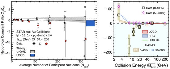 The STAR experiment also measured further higher-order cumulants up to the sixth order. Theoretically, the net-baryon is expected to be more sensitive to the QCD phase structure than , as its sign changes near the phase transition temperature [37]. The left panel of Figure 4 shows the centrality dependence of net-proton in Au+Au collisions at , 54.4, and 200 GeV [38]. The values from 27 and 54.4 GeV are consistent with zero within large uncertainties, while those from 200 GeV are progressively negative systematically from peripheral to central collisions. These negative signs are qualitatively consistent with lattice QCD calculations [39]. Thus, the results from 200 GeV could indicate the experimental signature of the smooth crossover at RHIC top energy. The collision energy dependence of (net-)proton is shown in the right panel in Figure 4 for Au+Au 0–40% and 50–60% collisions. The value from 0–40% centrality decreases with decreasing collision energy down to 7.7 GeV, while it is consistent with UrQMD calculations at 3 GeV. The decreasing trend down to 7.7 GeV is qualitatively consistent with the FRG model down to 7.7 GeV [40] and lattice QCD calculations down to 39 GeV [39], where both calculations predict a smooth crossover transition.