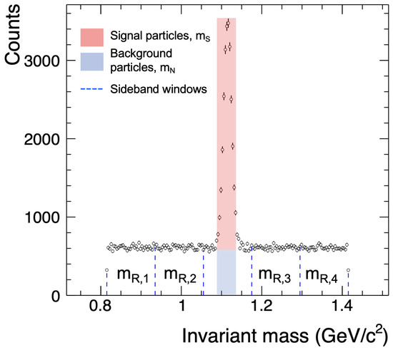 Figure 5 shows a sketch of the invariant mass distribution for [48]. The shape of the combinatorial backgrounds is assumed to be flat for simplicity. What we can measure in the experiment is always the sum of signal and background particles, , where is the number of signal candidates, is the number of signal particles, and is the number of background particles. However, it is impossible to identify and on an event-by-event basis. The second-order cumulant of signal candidates is expressed as: