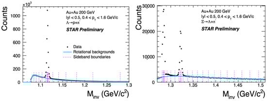 Invariant mass distribution of (left) and (right) hyperons. The cyan solid lines represent the rotation backgrounds, and the magenta dotted lines are the sideband boundaries for the purity corrections.