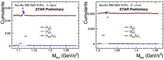 for case (2), where represents the difference between the number of particles and antiparticles of a particle species X. The coefficients in front of -related terms come from the fact that hyperons carry two strange quarks. To obtain and , all the second-order cumulants and mix-cumulants in Equations (16)–(19) were measured with efficiency corrections. Hyperons-related terms were corrected for their purities as well.