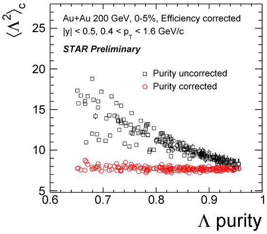 The 2nd-order cumulant as a function of purity from Au+Au most central collisions at 200 GeV. Purity-uncorrected results are shown by black squares, and purity-corrected results are shown by red circles. All results are corrected for reconstruction efficiencies. The branching ratio is not taken into account.