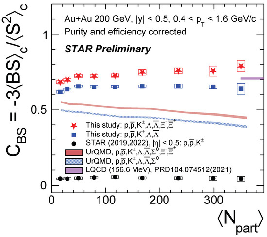 where denotes the baryon–strangeness correlation and is the second-order net-strangeness cumulant. The value is expected to be unity for the ideal QGP while it strongly depends on the baryon-chemical potential for the hadronic gas. However, the values extracted from previous STAR measurements [45] are between −0.12 and 0.043 for GeV, which is much smaller than the expectations. According to the model calculations [46], the signal of the baryon–strangeness correlations vanish once the strange baryons (hyperons) are excluded from the measurements. The values were thus very small as only (anti)protons and charged kaons were taken into account as proxies of net-baryon and net-strangeness, respectively, in previous STAR measurements.