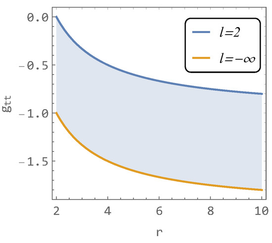 Figure 1 indicates that the function g t t can vary only between the curve g t t ( r ; l = 2 ) (Schwarzschild case) and the curve g t t ( r ; l = ) —the shaded region—where the curve g t t ( r ; l = ) represents the first non-physical solution.