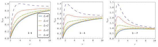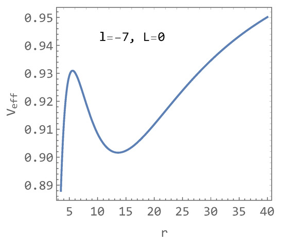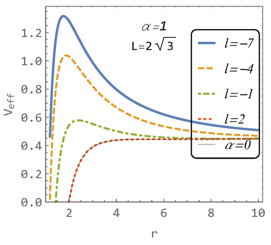 Figure 4 shows the effective potentials for different values of angular momentum L and the parameter l. As observed, a lower value of l emphasizes the maxima and minima of the effective potential (or conversely, the effective potential becomes more flattened for higher values of l). The parameter l exhibits a similar effect on the effective potential as the angular momentum L (see Figure 3).