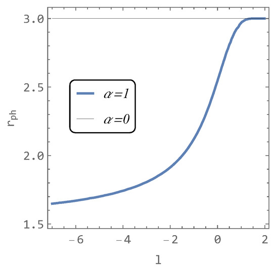 In Figure 6, one can see the results of the numerical solution of Equation (17). It is evident that as the parameter l decreases, the photon sphere approaches its limiting value of r phl = 3 / 2 .