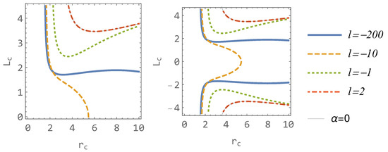 The dependence of the circular orbit r c on L c for various values of parameter l is illustrated in Figure 7. It is noteworthy that the curve corresponding to l = 10 lacks a minimum, signifying the absence of ISCO. In contrast, the curve associated with l = 200 exhibits the presence of two extremes (as commented later).