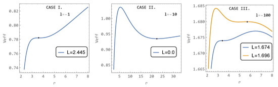 Case III. ( l < l t ): The behavior of the effective potential is more complex, and one can find two inflection points for two different values of L where stable circular orbits are located. Additional stable circular orbits are found in the minimum of the effective potential. All three cases and their specifics connected to the nearest stable circular orbit to the center or inflex points are presented in Figure 8.