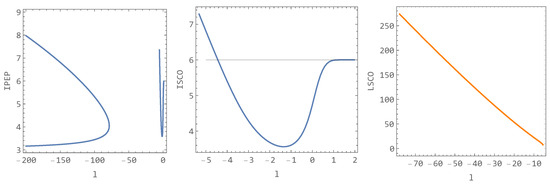 The dependence of ISCO on the parameter l ( l > l c ) is not monotonic and is presented in the central panel of Figure 9. On the left panel are plotted all IPEPs as a functions of the parameter l. Notice that the squeezed curve in the right part of the left (IPEP) panel is enlarged in the central (ISCO) panel. On the right, we observe a monotonically increasing distance of the LSCO. The LSCO curve continues from the end of the ISCO, as seen in Figure 10. Practically, this means that, as the parameter l is reduced approaching l c , the angular momentum L required to reach the inflection point of the effective potential gradually approaches zero. The last inflection point of the effective potential arises at l l c and L = 0 . Further reduction in the parameter l then leads to the creation of a maximum and minimum from the inflection point. This characteristic persists until l > l t .