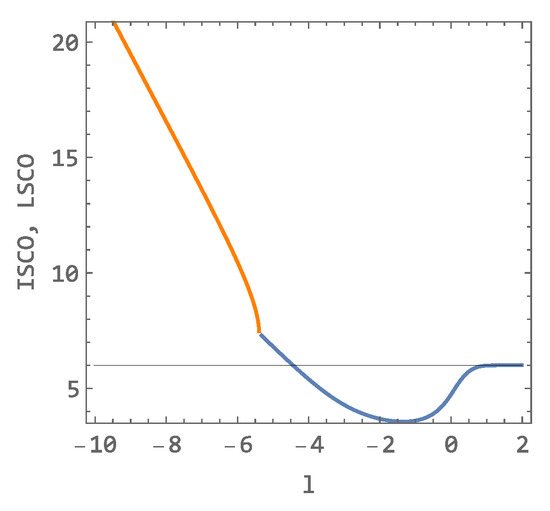Figure 10. The standard ISCO dependent on parameter l (blue curve) and LSCO dependent on parameter l (orange curve) presented at the location of the transition of both curves. Black line indicates Schwarzschild ISCO.