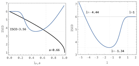 which transforms the parameter l such that the interval ( l c , 2 ) is squeezed into ( 0 , 1 ) , where l p = 0 corresponds to l = 2 (i.e., the Schwarzschild case), and l p = 1 corresponds to l = l c . The reason for this transformation is to have both parameters (l and rotating a) in the same range. The comparison of the effects of l and a on the ISCO is presented in the left panel of Figure 11. The right panel of the same figure suggests that the mimicry can occur only for l in the range approximately l ( 4.44 , 1 ) .