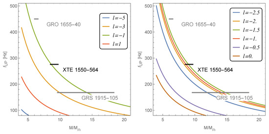 Table 1 presents the list of selected microquasars, their spin values, and the constraints on the parameter l obtained from QPO fits; l QPO comes from comparing astrophysical data with presented results, as seen in Figure 13, and the position of the innermost stable circular orbit (ISCO); l ISCO comes from comparing astrophysical data with presented results, as seen in Figure 11. However, despite the promising results, none of the three selected sources match both restrictions for the parameter l.
