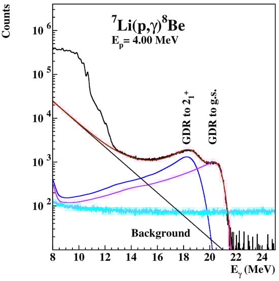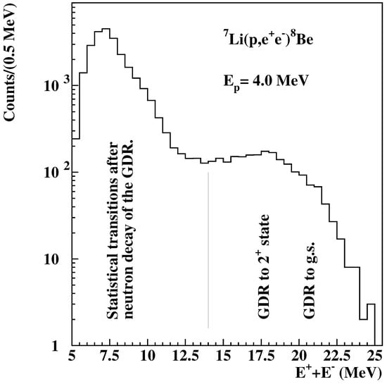 The experiments were performed in Debrecen (Hungary) at the 2 MV Tandetron accelerator of ATOMKI, with a proton beam energy of Ep = 4.0 MeV. Owing to the rather large width of the GDR ( = 5.3 MeV [16,17,18]), a 1 mg/cm2 thick 7Li2O target was used in order to maximize the yield of the e+e− pairs. The target was evaporated onto a 10 m thick Ta foil. The average energy loss of the protons in the target was ≈100 keV. radiation was detected by a 3″ × 3″ LaBr3 detector, monitoring also for any potential target losses. The detector was placed at a distance of 25 cm from the target at an angle of 30° to the beam direction. A typical energy spectrum is shown as a black histogram in Figure 1.