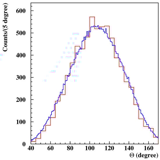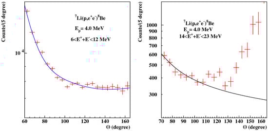 The angular correlation gated by the low-energy-sum region (below 14 MeV), as marked in Figure 4, is shown in the left side of Figure 5. The measured counts were corrected for the acceptance obtained as described in Section 2.2. It is a smooth distribution without showing any anomalies. It could be described by assuming E1 + M1 multipolarities for the IPC process and a constant distribution, which may originate from cascade transitions of the statistical decay of the GDR appearing in real coincidence. In such a case, the lepton pair may come from different transitions, and thus their angles are uncorrelated. This smooth curve reassured us that we were able to accurately determine the efficiency of the spectrometer. The angular correlation of the e+e− pairs gated by the GDR energy region (above 14 MeV), as marked in Figure 4, is shown in the right side of Figure 5.