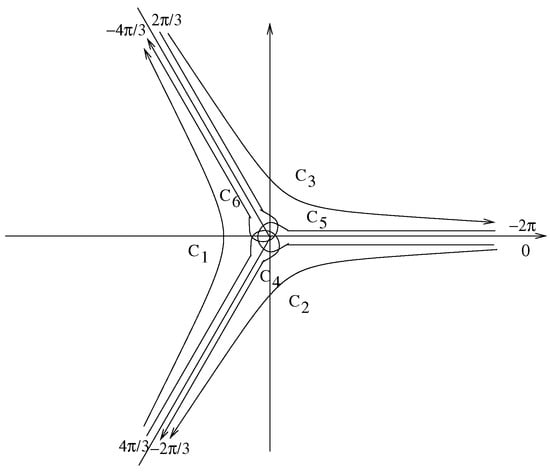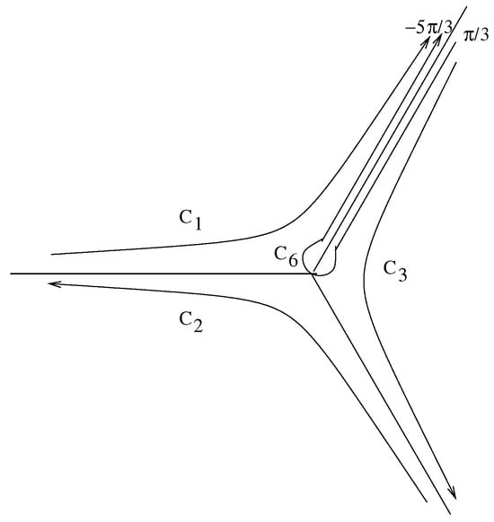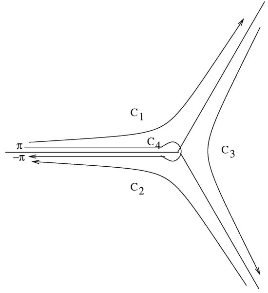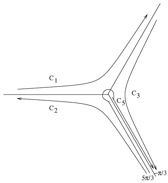 In order to find physically relevant solutions of (5), we adopt the strategy utilized in [1]. We refer to Figure 1, and we choose to directly construct the relevant physical states by exploiting the method of the steepest descents [45,46,47] for approximating, as , the solutions occurring in B1. We need to consider, of course, the solutions (10), which, by setting , can be rewritten as
