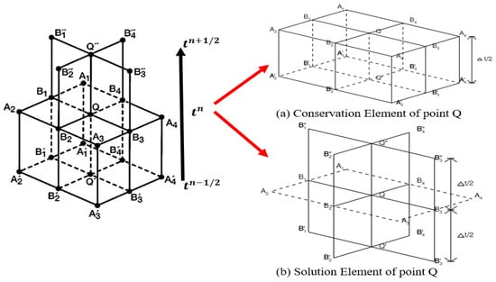 where is the boundary of any closed space–time region V in . denotes the total space–time flux leaving the surface element . denotes the solution point, and its conservation elements (CEs) is represented by the hexahedron , as shown in Figure 1a. The SE of point Q is the union of the three plane segments , and , as shown in Figure 1b. In addition to the method shown in Figure 1, there are also various other ways to construct CEs and SEs, as long as all the constructed CEs can cover the entire space–time domain and that their SEs cover the boundaries of all the CEs but never overlap with each other. Because the conservation law, i.e., Equation (3), is suitable for an arbitrary closed space–time domain, generally, it is the best choice to build CEs that can facilitate the derivation of the discrete form of Equation (3). In SEs, since the values of variables and fluxes are continuous, the value at any point in an SE can be approximated from the value of known points through Taylor expansion, and the order of Taylor expansion determines the order of the scheme. After the integration over all the boundary surfaces of CEs, we obtain the updated variables as follows: