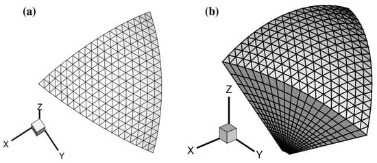 The grid structure for 3D CESE computations: (a) at the solar surface and (b) in the corona. As depicted in the same figure referenced from Feng et al. [].