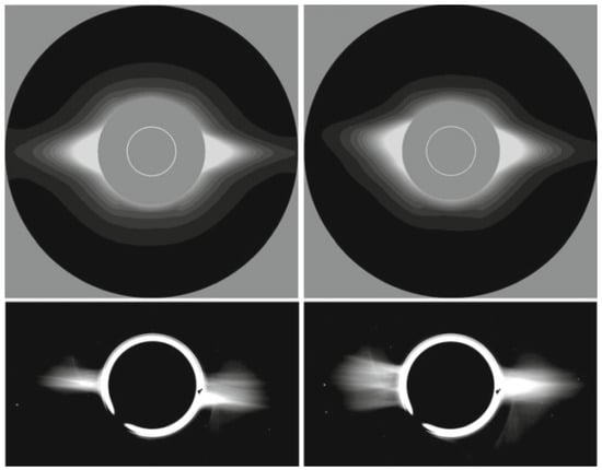 The coronal polarized-brightness images, spanning the radial distance from to , have been meticulously computed through simulation (depicted in the upper panels) and observed by the LASCO C2/SOHO instrument aboard the SOHO spacecraft (displayed in the lower panels). The top-left and top-right panels offer distinct projections onto the meridional planes, specifically featuring angles of – and –, respectively. These projections provide valuable insights into the coronal structure from differing perspectives. The observations in the lower panels, captured on 5 July and 28 June, respectively, serve as a direct comparison with the simulated images, facilitating a comprehensive analysis of the coronal polarized brightness. This visual juxtaposition is drawn from Figure 9 in Feng et al. [].
