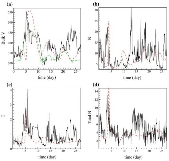 The comparison analysis presented in Figure 18 in Feng et al. [] meticulously examines three distinct data sets: (a–d) the simulated outcomes of the MHD model (depicted by a dashed red line), the velocity predictions derived from the Wang-Sheeley model (represented by a dashed green line), and the empirical observations recorded by the WIND satellite (solid black line).