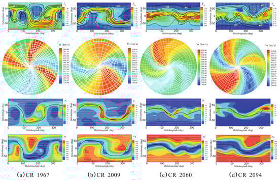 The MHD model simulates the steady-state solutions in interplanetary space for Carrington Rotations (CRs) 1967 (column a), 2009 (column b), 2060 (column c), and 2094 (column d). The visualizations showcase isolines of radial velocity (units: km s−1) overlaid on a synoptic pseudo-color image of mass fluxdensity (units: 108 km s−1 cm−3) at (Row 1). Row 2 presents pseudo-color images of radial velocity on the solar equatorial plane, with white quadrilaterals marking grid blocks; the finer-grained blocks correspond to the adaptive mesh refinement (AMR) grid intersecting the solar equator. Rows 3 and 4 exhibit synoptic contours of simulated proton number density N (units: cm−3 and (units: km s−1), respectively, at , with black lines outlining magnetic neutral lines. From Figure 5 in Feng et al. [].