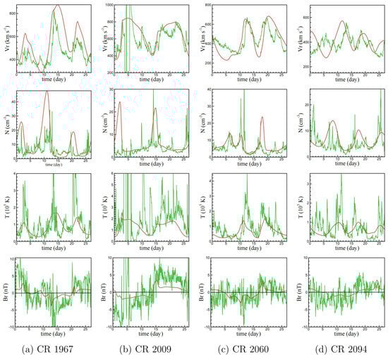 The calculated MHD steady at 1 AU for CR 1967 (column a), CR 2009 (column b), CR 2060 (column c), and CR 2094 (column d). The first, second, third, and fourth rows are the comparisons between the MHD results and the 1 h averaged OMNI data near 1 AU for radial solar wind speed , number density N, temperature T, and radial magnetic field , respectively, where the green lines denote the observations and the red lines represent the numerical results. From Figure 6 in Feng et al. [].