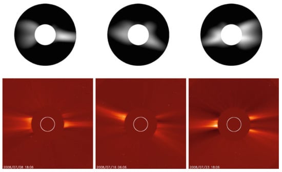 The figures presented, adapted from Figure 4 in Feng et al. [], exhibit a comparative analysis of white-light polarized-brightness images derived from two distinct sources: a data-driven magnetohydrodynamic (MHD) model (showcased in the top row) and observations captured by the Large Angle and Spectrometric Coronagraph (LASCO) aboard the Solar and Heliospheric Observatory (SOHO) spacecraft (displayed in the bottom row). These images are organized chronologically, i.e., 8 July (left column), 16 July (middle column), and 23 July (right column), offering a temporal progression of the solar corona’s polarized-brightness characteristics.