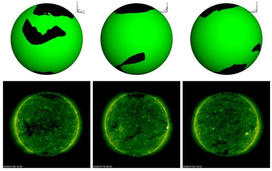 The top row, derived from Figure 3 in Feng et al. [], presents the open- and closed-field distributions derived from the data-driven magnetohydrodynamic (MHD) model, while the bottom row showcases the Extreme-ultraviolet Imaging Telescope (EIT) observations at 95 Å for 8 July (left column), 16 July (middle column), and 23 July (right column). This figure provides a comparative analysis between model results and actual observations.