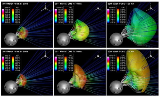 Three-dimensional CME evolution of 1T and 2T models by using the SWMF model. The iso-surface represents Vr = 1000 km s−1. The color on the iso-surface shows the proton temperature. The field lines are colored by plasma density. Taken from Figure 9 in Jin et al. [].