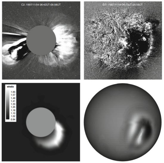 Top: C2 and EIT difference images. Bottom: Synthetic white-light running ratio image corresponding to C2 field of view (left) and numerically simulated density-enhanced image of the solar disk (right). Reprinted from Figure 4 in Zhou et al. [].